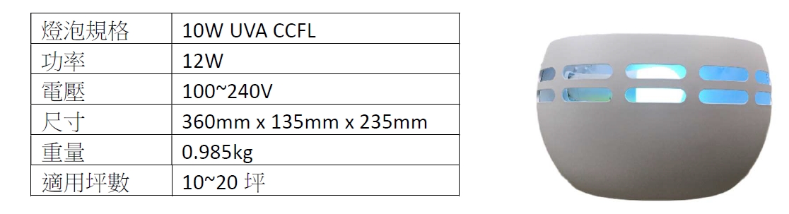 壁掛式捕蟲燈UVA CCFL(冷陰極螢光燈管) 本款壁掛式捕蟲燈,採用UVA CCFL(冷陰極螢光燈管)燈泡,並在燈泡塗布光觸媒,增加其誘捕的效果。UVA紫外線具有良好的誘蟲效果,光觸媒則具有近人體的味道,可吸引蚊子等昆蟲。採用黏捕紙方式,乾淨且不髒亂。其優點如下: ★ 具UVA紫外線誘蟲效果★ 燈泡塗布光觸媒增加誘蟲效果★ 黏捕紙方式,乾淨且不髒亂。黏蟲紙平均一年更換4-8次,具體根據蟲害情況而定。★ 採用10W UVA CCFL燈泡,具有2~3年長期的誘捕效果。但建議可於1年更換燈泡,讓其效果接近100%。★ 燈泡為全電壓燈泡設計,適用於110V及220V的電壓。★ 輕巧設計。整體重量不超過1kg。★ 安裝簡單。可使用3M耐重1.5kg無痕掛勾或鑽孔打進膨脹螺釘固定即可。 貿易進出口商品 次世代CCFL照明商品氟素緩衝材緩衝紙斷熱材 翻譯及口譯 翻譯服務口譯服務口譯人才育成譯者招募 關於我們 關於新驊聯絡我們 新驊股份有限公司Sinphae Technology Corporation114046台北市內湖區康寧路三段54-6號3樓Tel : 02-2630-9815Fax: 02-2630-9808 3F., No.54-6, Sec.3 Kangning Rd., Neihu District, Taipei City 114046,Taiwan(R.O.C.)stephending@sinphae.com.tw