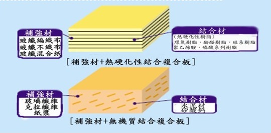 一般我們所講的「高強度斷熱材」,其構造會由補強材及結合材構成。「補強材+熱硬化性樹脂複合板」,是指將補強材含浸複合材材料,多層積層加熱加壓硬化而製成的成形板材。而「補強材+無機質複合板」則是將短纖維的補強材與複合材材料混合,經高壓壓合製成的成形材。