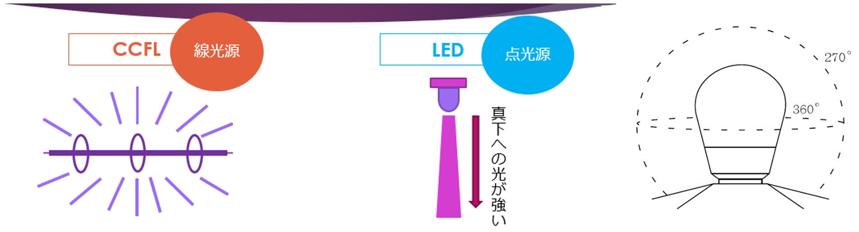 従来、液晶ディスプレイのバックライト用白色光源としては、冷陰極蛍光ランプ(CCFL)が利用されてきました。CCFLは、ガラス管の中に不活性ガスを封入した密閉型の蛍光灯です。この管に高電圧をかけると、ガスがイオン化して紫外線(UV)が発生します。この紫外線が内部の蛍光体コーティング層を次々励起し、可視光線が発生します。